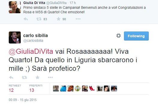E lui risponde :"Vai Rosaaaaaaaa! Viva Quarto! Da quello in Liguria sbarcarono i mille ;) Sarà profetico?". Peccato che i Mille sbarcarono a Marsala e non a Quarto.
