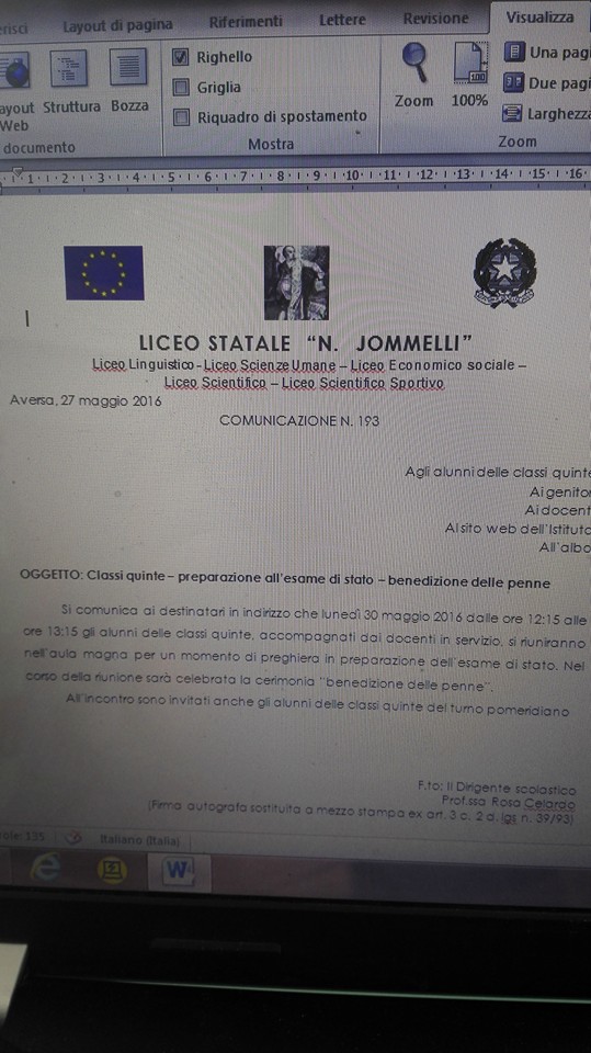 Ai maturandi del liceo multidisciplinare di Aversa (Linguistico; Scienze Umane; Economico-sociale; Scientifico e Scientifico-Sportivo) è arrivata qualche ora fa una comunicazione in tal senso, vergata dal dirigente scolastico Rosa Celardo. «Lunedì 30 maggio 2016 dalle ore 12.15 alle ore 13.15 gli alunni delle classi quinte, accompagnati dai docenti in servizio, si riuniranno nell’aula magna per un momento di preghiera in preparazione dell’Esame di Stato. Nel corso della riunione sarà celebrata la cerimonia “benedizione delle penne”».