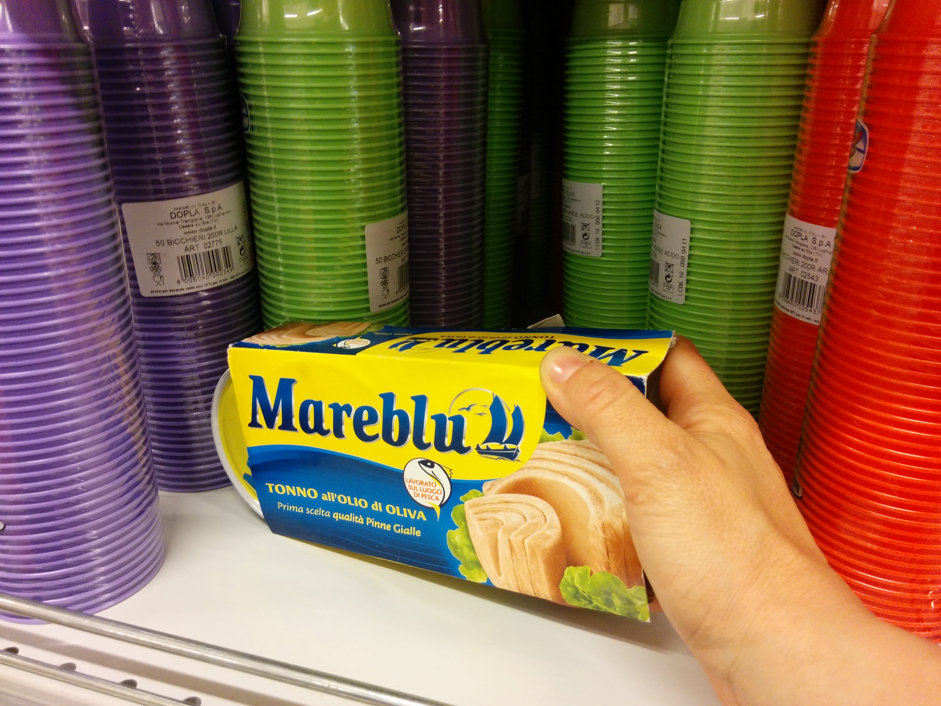 1) Vai al supermercato e sposta le scatolette di Tonno Mareblu in un altro scaffale (ad esempio tra i biscotti o i pannolini!) in modo che per un giorno altri consumatori non possano essere suoi complici ignari!