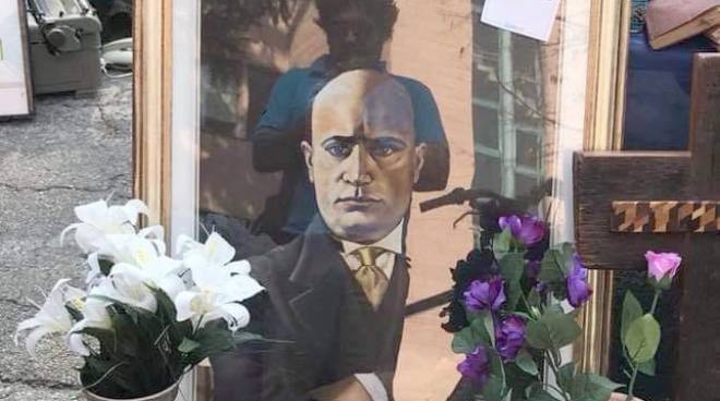 CORSICO ( MI )- Al mercato delle pulci di Buccinasco un venditore con regolare bancarella ha esposto un quadro raffigurante l'essere piu' ignobile della storia d'italia - Era in vendita , ma aveva appeso un biglietto con la scritta " è ora che torni ".